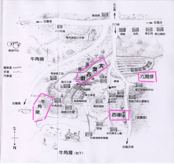 俯瞰南竿島全域地貌,先民咸認為酷似「牛」狀圖騰,於是執「牛角」的地位,拱手讓給牛角澳;牛角人亦不辜負眾人期待,崢嶸多項馬祖第一殊榮,諸如:第一任民選縣長、第一位大學生、首任立法委員...等。打開牛角澳共同記憶之匣,依空間分成四區:
